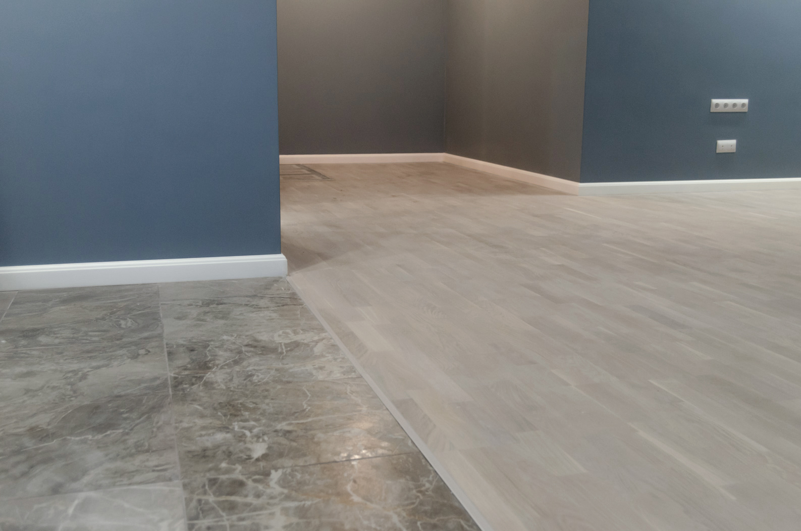 Стык с паркетной доской оформлен с помощью тонкого матово-алюминиевого профиля.