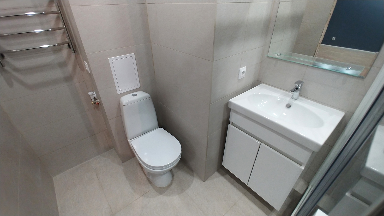 Заказчик - современный молодой человек, трудится в сфере IT. Однокомнатную квартиру перепланировали по его желанию в студию: кухня объединена с комнатой, перегородками выделено место под кровать.