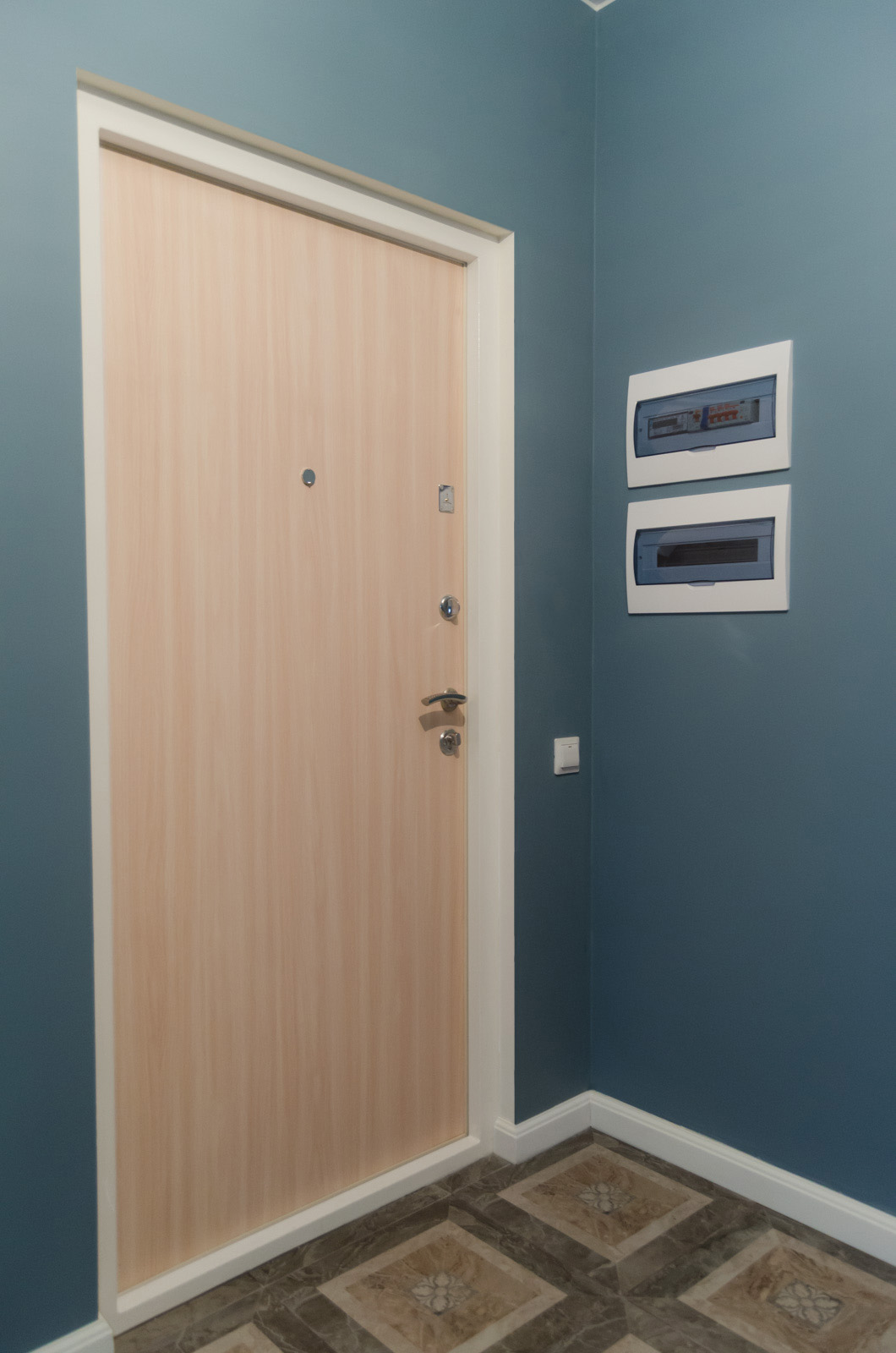 Керамогранит у двери повторяет такой же в зоне кухни, но имеет узор.