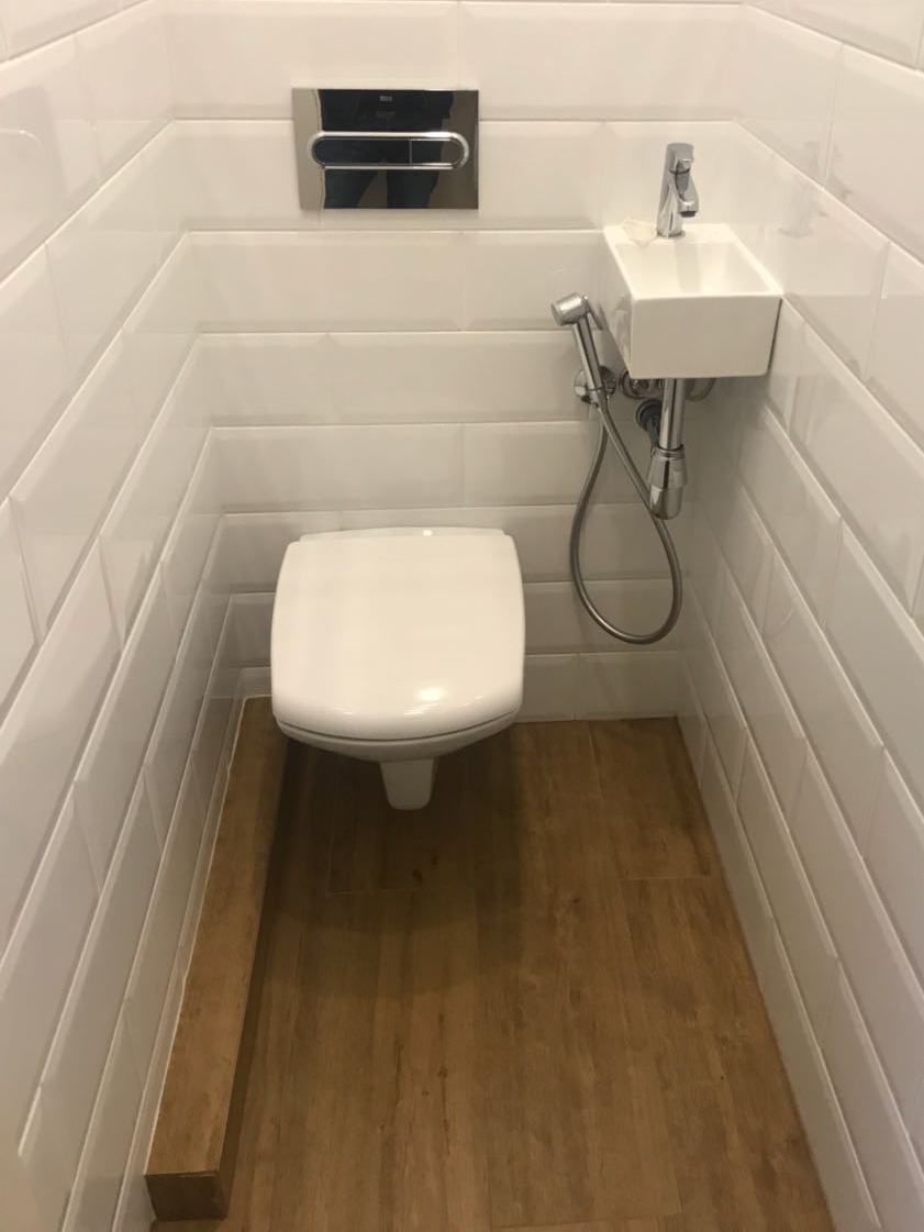 Заказчик решил не выламывать весь бетонный пол клетки санузла, а наоборот: мы добавили стяжку в нишу после переноса стенки и превратили высокий пол в "деревянную" плиту. Смотрится отлично, но, предупреждайте своих гостей о ступеньке.