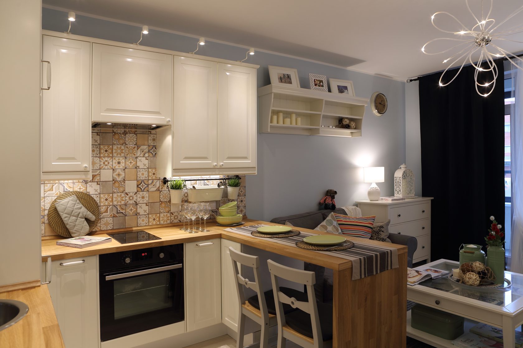 Мозаичный фартук теплого оттенка и столешница из натурального дерева хорошо зонируют кухню от остальной части помещения.